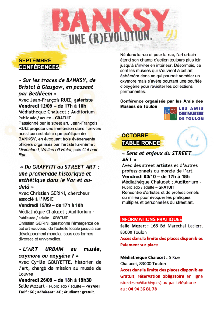 La première conférence de l’année: le 26 Septembre 2025 à 18h – Salle Mozart. Cyrille GOUYETTE « L’art urbain au Musée, oxymore ou oxygène »